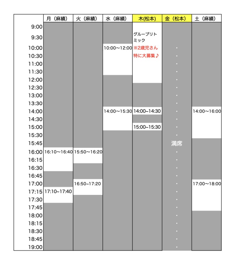 R7.11〜のレッスン枠空き状況 2025.10.292024.02.15 R7.11〜のレッスン枠空き状況 月・火・水・土 麻績教室木・金 松本教室にて開講 麻績教室バスで通いたい方はこちらをご参考に・・・ 体験レッスンご予約はこちら