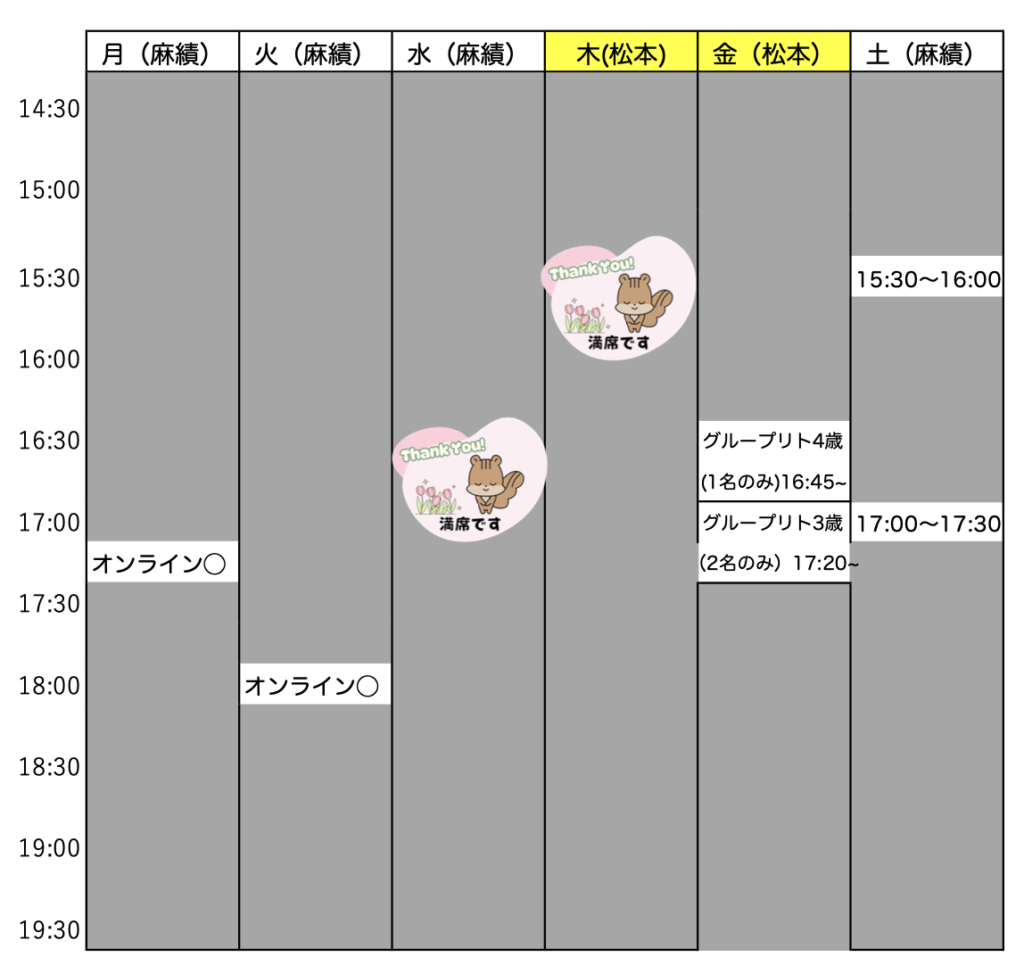 14:30~19:30 すべての枠でレッスン枠の予約を承ります。(キャンセル待ち)